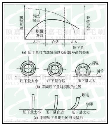 ????? 這也可從刷毛磨損的形態(tài)來判斷。如果刷毛頂端是平齊的,則說明刷毛基本未變形,壓人量太小,無刷洗作用;如果刷毛頂部較長一段范圍內都有磨損,刷毛變成扁尖形狀,則說明壓下量太大,這種情況刷毛極易被折斷或磨斷。正常的刷毛頂端略有傾斜,這時的彈力最足,刷洗力最強,因而效果最好,而且壽命也較長。