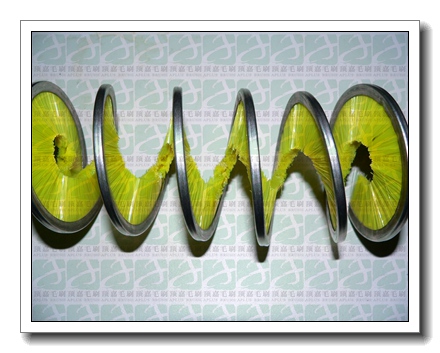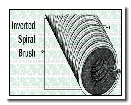 英文名Inverted brush,Spiral brush或者Screwed brush,由剛性部件(毛刷底座)和柔性部件(刷絲部分)組成,呈內螺旋或者外螺旋狀,刷絲常見為尼龍塑料絲、金屬絲如銅絲或鍍銅鋼絲等,底座常見為鍍鋅鐵(Galvanized steel),或有不銹鋼底座,但并不多見。